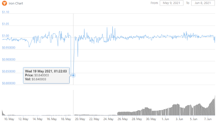 The month of May has been a tumultuous one for crypto markets, as bearish sentiment has taken over and sent the price of Bitcoin and alts crashing. The most painful portion of this crash occurred on May 19, sending the price of Bitcoin from ~$43k to ~$30k in a matter of hours as the market capitulated. Throughout this flash crash, many stablecoins struggled to keep the peg, as many of the stabilizing algorithms could not keep up with the falling tide. In this article, we’re going to analyze the IRON peg and compare it to some of its alternatives.