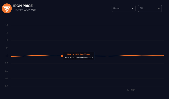 To get a clearer picture of how the peg performed during the Bitcoin crash, we can look at Iron’s chart on our website. It shows that even on May 19, the IRON peg never truly deviated from the peg by more than a few thousandths of a cent.