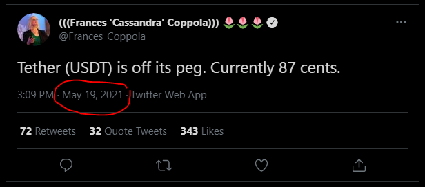 As the name implies, Tether — or, USDT — is supposed to remain “tethered” to the US Dollar. Its whole purpose as a token is to exist as a safe hedge on exchanges for traders to park their funds, and represent the true fiat value of their portfolio. However, on May 19, Tether experienced a sharp decline from its pegged value, falling as low as 87 cents: